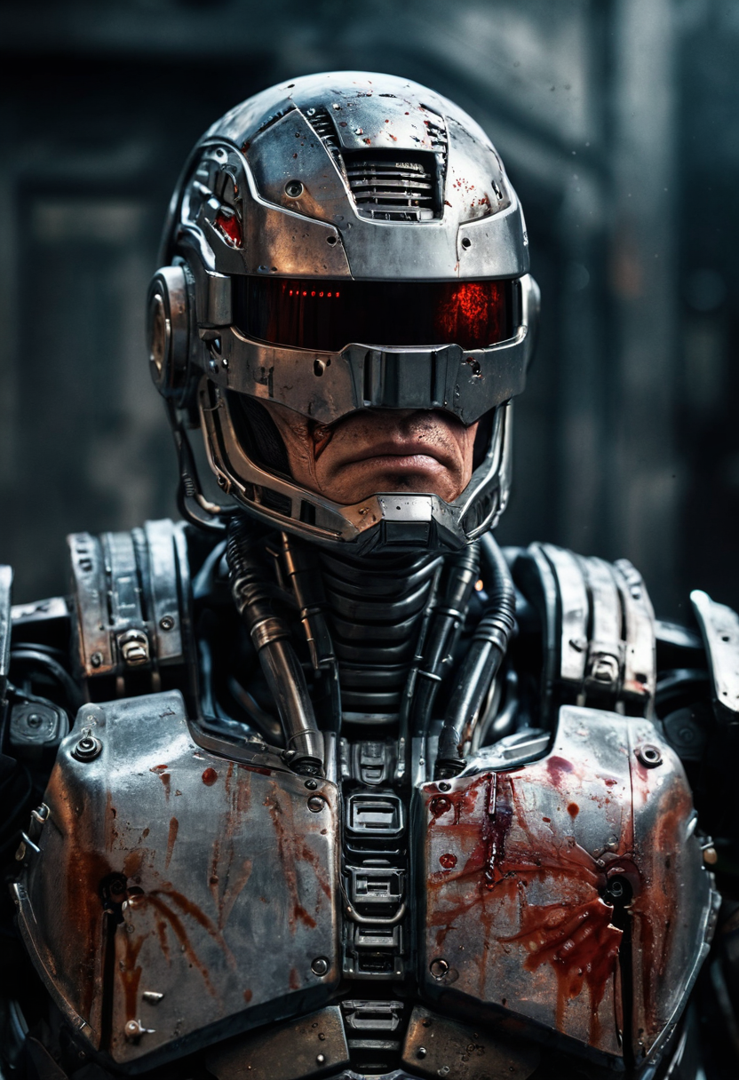 ((A close-up portrait)) Robocop, a dilapidated cyborg with mechanical armor, stained with blood and dust. Detailed metal textures, . Futuristic dystopian atmosphere, aggressive lighting with cold glare. Darksyber aesthetic, photorealistic style