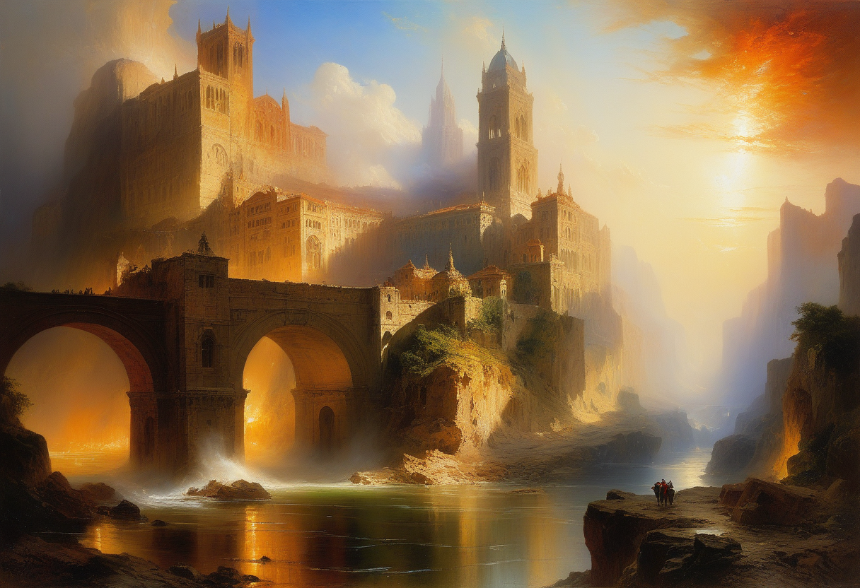 <lora:10NaturalismPainting_Hap_XL:1.5>, Thomas Moran style, oil painting, nature, depic a cityscape that merges the modern cuberpunk world with a phantom-like, etheral dimension, highligghting ghostly figures and structures