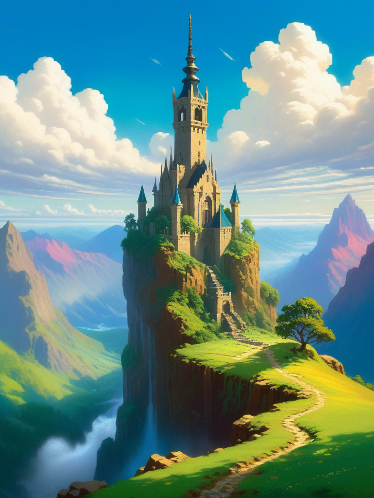 <lora:10NaturalismPainting_Hap_XL:1.5>, Thomas Moran style,oil painting,nature,landscape, Isometric stone tower rising majestically in a pixelated game landscape, simple lines forming a sturdy base tapering into a whimsical spire, cartoonish charm, moat encircling its base, lush green grass dotting the terrain around, soft shadows implying a bright, cheerful sky above, digital render suitable for game asset, 8-bit color scheme.ï¼