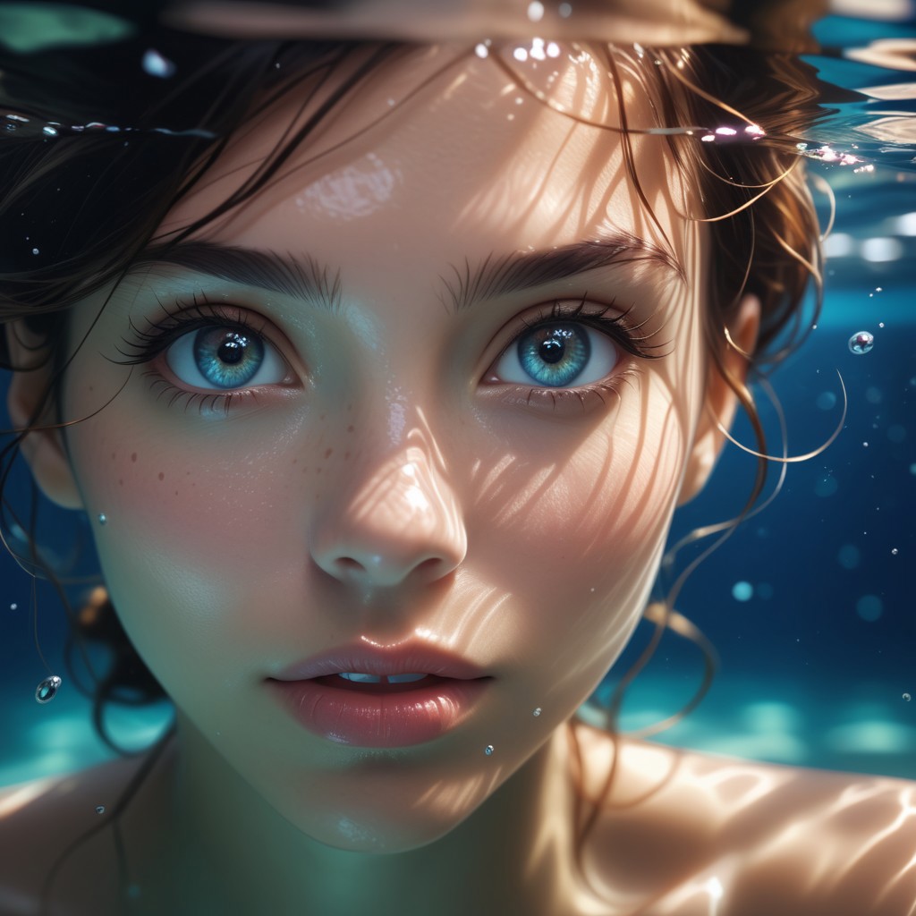 Extreme close-up professional underwater scene focusing on her face. (A woman, fanciful and beautiful underwater). Pure face complexion, radiant features. Beautiful, very detailed expressive eyes. A single water level. Photorealistic, natural ambient lighting, intricate details, 35mm photography, film, professional, 4K visuals, highly detailed, elegant, studio quality.
