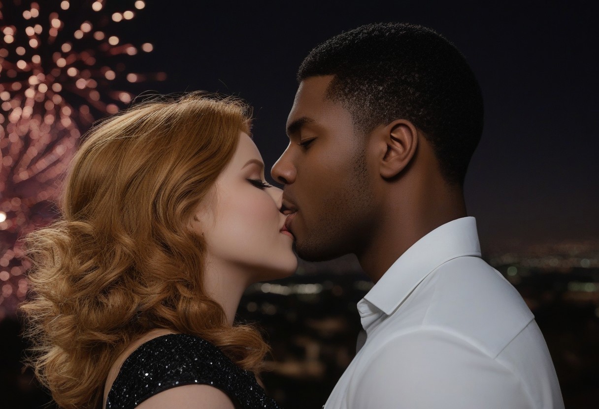 Caucasian actress/singer Renee Olstead and African American actor/model Broderick Hunter share a steamy kiss while backlit by a spectacular display of fireworks going off in the night sky. Both look happy and in love with each other. Broderick wears a white satin shirt and black pants. Renee wears a sparkly black dress. Renee has lovely makeup on her face. Nighttime. Romantic ambiance. High sexual tension. Symmetrical eyes. Symmetrical faces. Lovely details. Photorealistic. Full-colored photo. Professional photo. Highly detailed 8K.