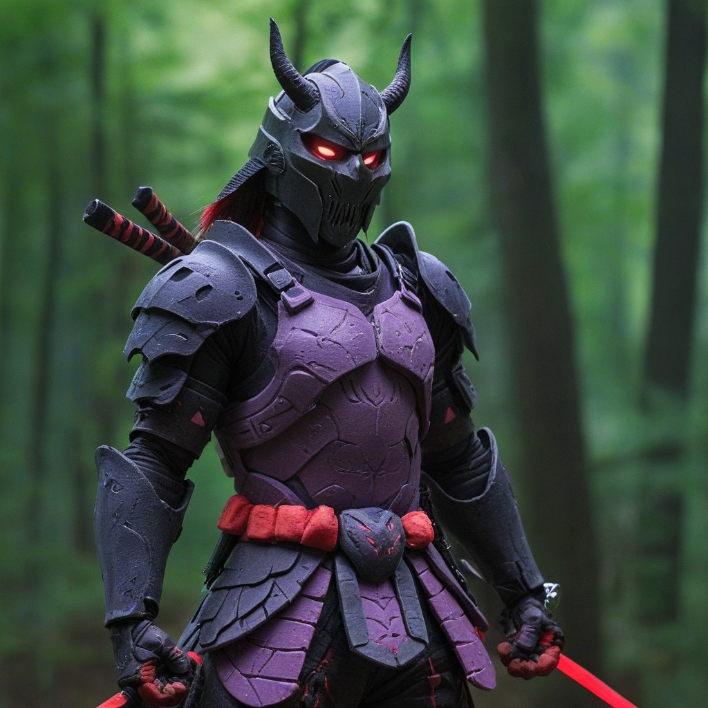 novuschroma51 style, claymation, A Samurai made of clayb holding a glow sword, solo, intricate texture, dragon patterns, armor, 1boy, male focus, holding, dual wielding, samurai, helmet, katana, horns, red armor, black patterns holding weapon, japanese armor, holding sword, light purple skin, red eyes, full body, fighting stance, forest background, forest, glowing, glowing eyes, sheath, standing, gloves, teeth, japanese clothes, white hair, shoulder armor, looking at viewer, mask, ponytail, fangs, sharp teeth, shape armor