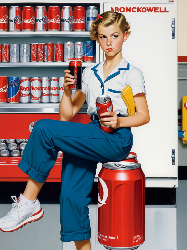 <lora:04Vintageillustration_Hap_XL:3.3>,Norman Rockwell style girl, short hair, pants, middle school , study hard, energy drink
