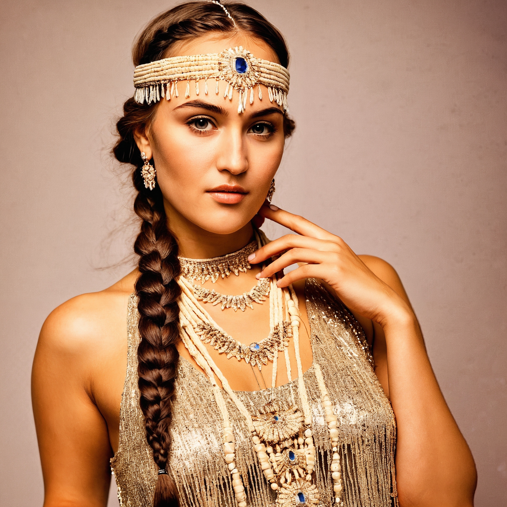RAW full body analogue photo of a beautiful 20 years old woman, clear focus, 8K,__Random_Woman__,perfect face, sexy pose, wearing The Glamorous Gatsby: A beaded and sequined flapper-style dress with a dropped waistline, accessorized with a feathered headband and long beaded necklace, perfect eyes, detailed eyes, detailed iris, realistic skins absolute perfect tits, soft tits, natural tits ,low light, soft natural light, Rembrandt style light, Hasselblad DLSR camera, 200mm Zeiss lens, f/2.8, ,Sexy pose, erotic pose, exhibitionism, (braided hair:1.3), medium breasts (sexy thicc body)
