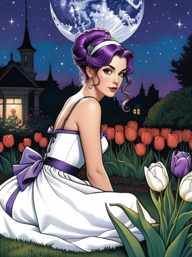 <lora:04Vintageillustration_Hap_XL:3.3>,Norman Rockwell style cwitty comic book style ink colored pencil drawing of Tulip, a pokemon trainer with purple hair styled in an updo, wearing a revealing white and purple dress. She has large expressive eyes, full lips, and a curvaceous figure. The settings vary - one shows her sitting outside at night in a garden-like area with flowers, another inside an ornate room with chandeliers, and another against a starry night sky backdrop. Her poses and expression suggest a flirtatious, glamorous persOna