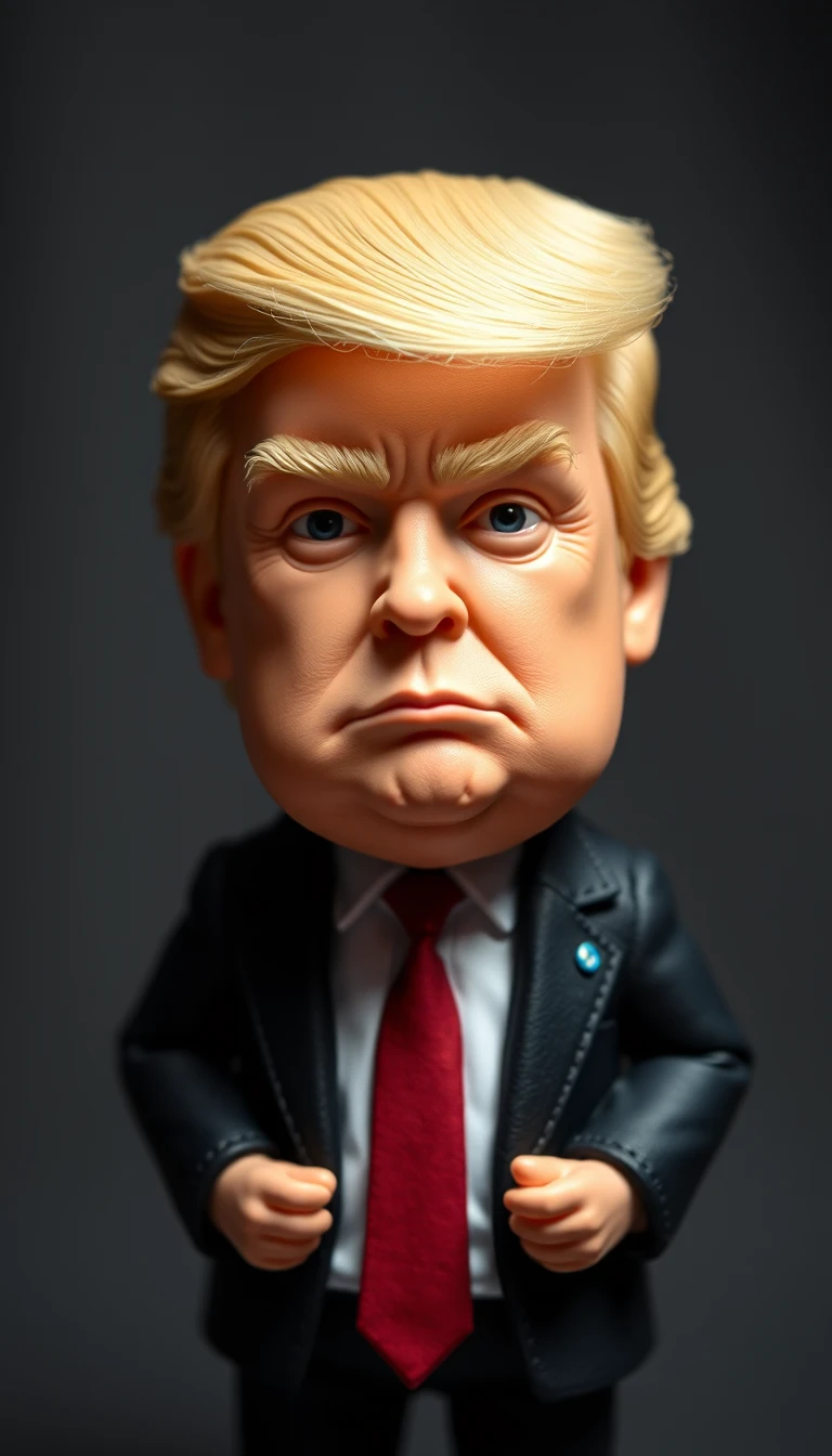 In mini doll format, real caricature of President Trump, flattering and sarcastic appearance, looking at the camera...