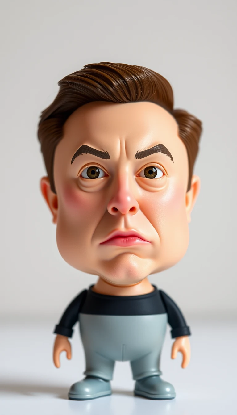 In mini doll format, real caricature of Elon Musk, flattering and sarcastic appearance, looking at the camera...