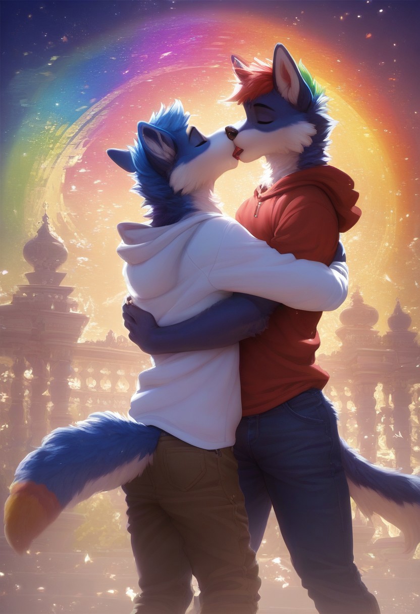 score_9, score_8_up, score_7_up,score_6_up, source_furry, Furry Mix PDXL, furry male, highly detailed, hyperrealistic, extremely fluffy, ,, dynamic pose, beautiful vibrant colors, intricate details, cinematic lighting, photorealistic, 8k, masterpiece , high quality,F.M PDXL, (((2boys))), thigh up view, kissing, hooded shirt, pants (((by <pochemu>))), Expressiveh, rainbow background, hearts