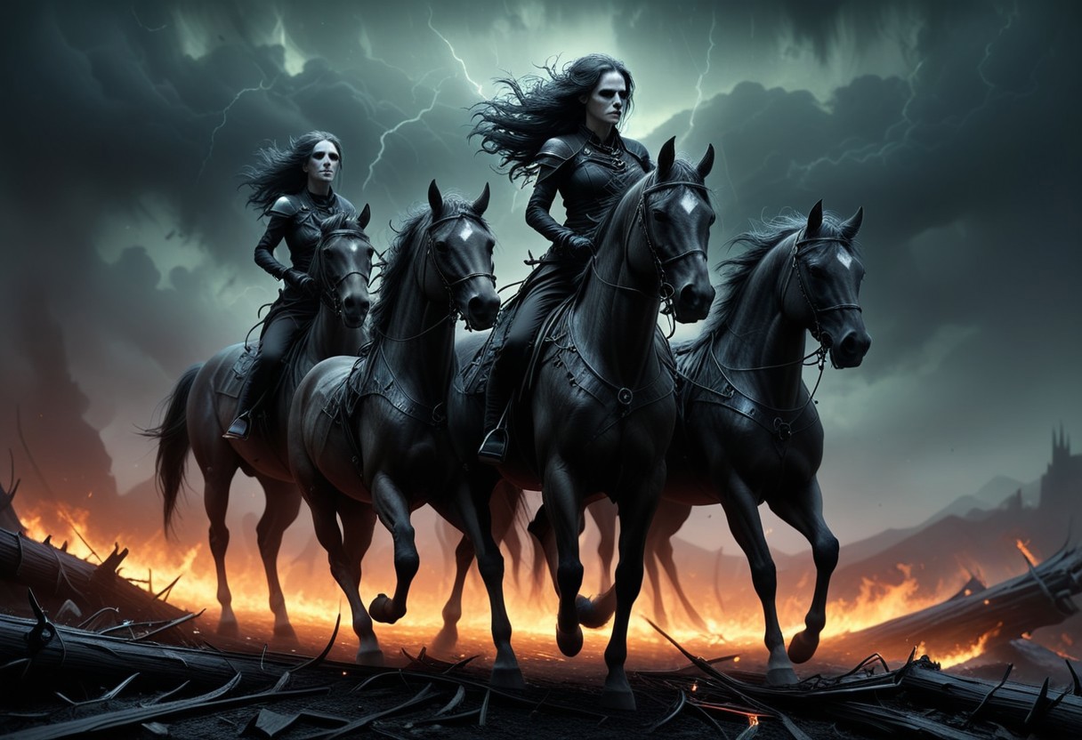score_9, score_8_up, score_7_up, (Fantasy Horsewomans of the Apocalypse). The four Horsewomen of the Apocalypse stand in a menacing formation, their monstrous steeds rearing behind them, silhouetted against a burning, storm-ridden sky. Their powerful, nearly naked bodies are each adorned with minimal yet distinct garments—War in jagged black metal armor barely covering her, Famine in a sheer, tattered veil clinging to her emaciated yet seductive form, Pestilence draped in dark chains that contrast her flawless yet sickly skin, and Death wrapped in a ghostly shroud that moves like living mist. Their weapons—greatsword, scythe, censer, and ethereal blade—gleam ominously, reflecting the suffering they bring. Their combined presence radiates both divine beauty and unstoppable doom. ((cinematic photo, volumetric lighting, cinematic lighting, aesthetic design, high angle, dramatic framing, cinematic framing, unique artistic composition, hight reflection)), (maximum ultra-high definition image quality and rendering:3), maximum image detail, maximum realistic rendering, (beautiful face), (full-length)