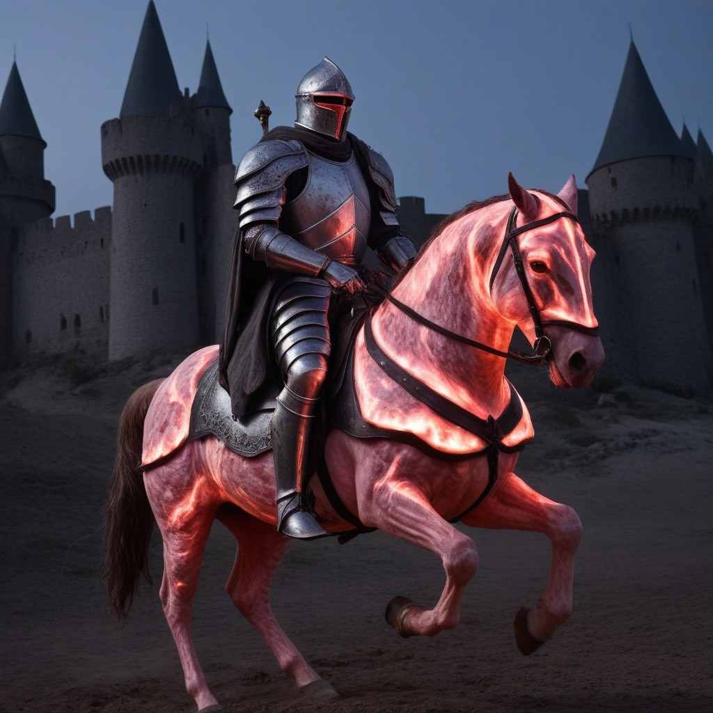 made of wagyu, score_10 , score_9_up, score_8_up, score_7_up , score_6_up, a realistic armored knight is riding a horse made of wagyu, glowing eyes, armor made of meat, night background, moon, eerie atmosphere, gothic, grim dark, fantasy art, medieval, detailed light pink and white armor, eerie glow, full armor, red glowing eyes, cape made of meat, rocky ground, fantasy creature, pink theme, fantasy setting, high contrast, detailed meat textures, ominous, realistic lighting, haunting, eerie glow, medieval fantasy, gothic style, detailed rendering, fantasy character, pink ambiance, eerie environment, fantasy creature, armored knight, glowing eyes, riding horse, knight over horse, realistic castle, castle background, smiling