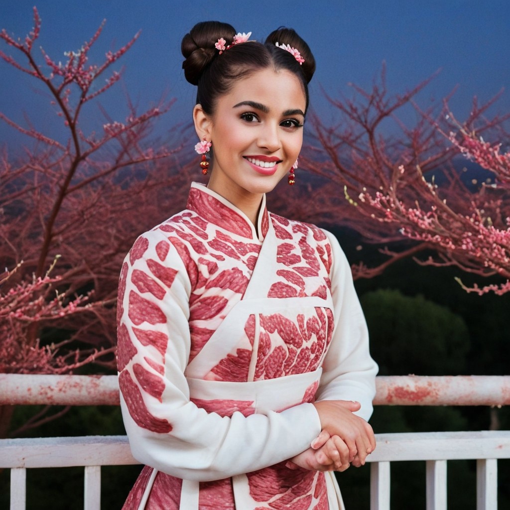 made of wagyu, a woman, asian, black hair, brown eyes, chinese clothes made of meat, meat texture, clothes made of meat, medium body shot, smiling, dress made of wagyu, earrings, meat patterns, highly detailed, photorealistic, fence, print, flower, hair bun, hair ornament, hair stick, hand up, jewelry, leaf, light skin, light smile, lipstick, long hair, long sleeves, looking at viewer, makeup, moon, night, outdoors, parted bangs, plant, railing, red lips, single hair bun, sky, sleeves past wrists, slim, solo, standing, updo, upper body, pink and white hanfu, white flower, wide sleeves,