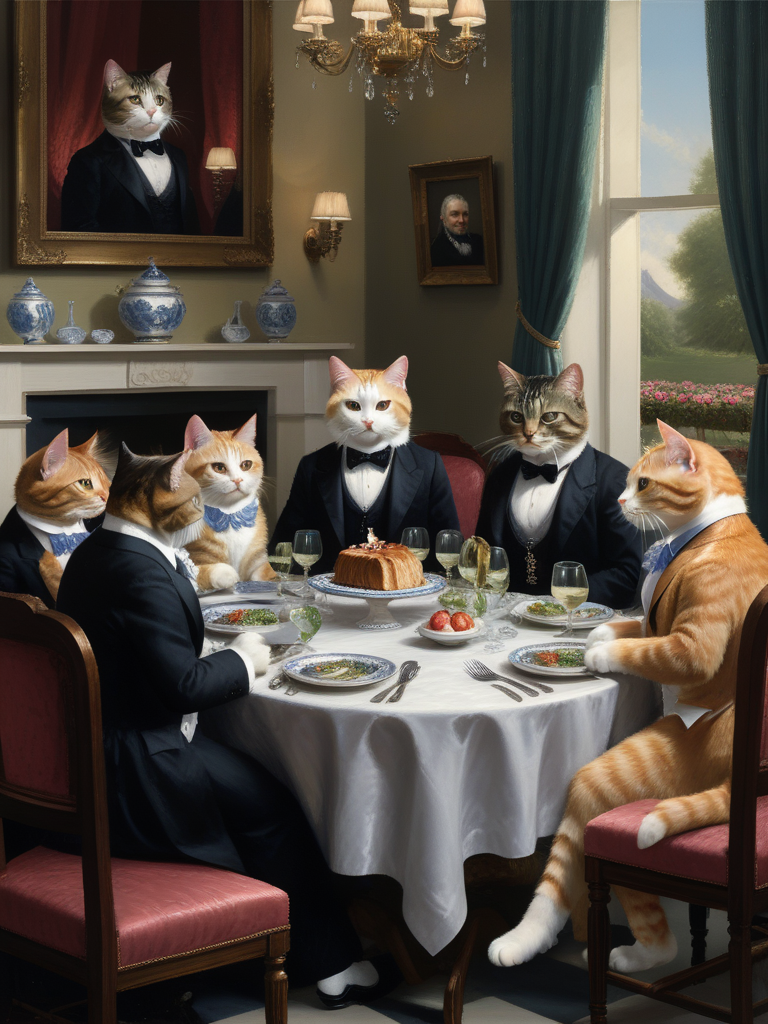 <lora:03realismPainting_Hap_XL:2.6>, realism American art painting oil painting,masterpiece,highly detailed, <lora:add-detail-xl:0.0001> ,<lora:hand 4:0.0001>, A classic oil painting depicting a group of cats dressed in formal attire, attending a fancy dinner party and discussing the latest catnip gossip.