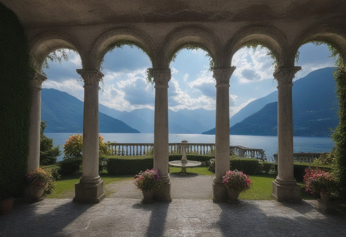 A view of Lake Como from an old Italian villa with columns and arches, flowers in white on each side of the arched doorways, the dramatic and cloudy sky with sun rays shining through, mountains visible across the water,