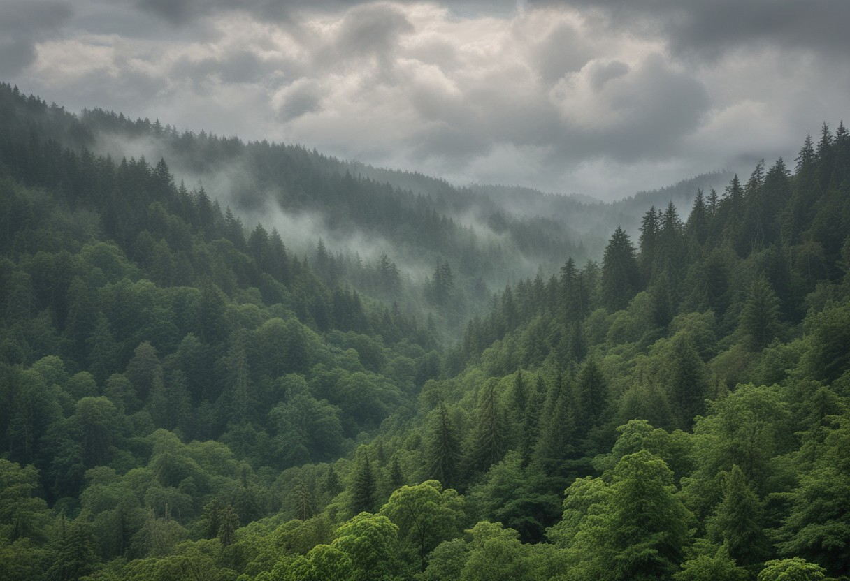 masterpiece, photorealistic, pacific northwest, rainforest, misty, hills, dense trees, cloudy sky, clouds, serene, peaceful, uninhabited