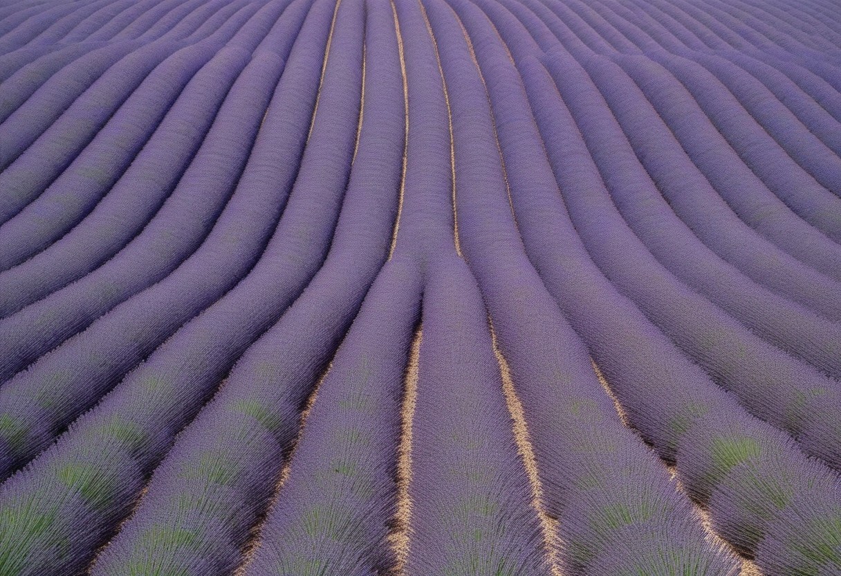 close-up A lavender field under a blue sky in Provence, with rows of purple flowers stretching to the horizon, aerial perspective, showing the vastness of the landscape, in the style of nature photography