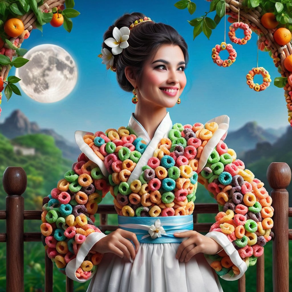 score_10 , score_9, score_8_up, score_8, Masterpiece, High Details, HD, 8K, Photorealistic, perfect, High Quality, a woman, asian, black hair, brown eyes, chinese clothes made of fruit loops, FrootLoops texture, clothes made of fruit loops, medium body shot, smiling, dress made of fruit loops, earrings, FrootLoops patterns, highly detailed, photorealistic, fence, print, flower, hair bun, hair ornament, hair stick, hand up, jewelry, leaf, light skin, light smile, lipstick, long hair, long sleeves, looking at viewer, makeup, moon, night, outdoors, parted bangs, plant, railing, red lips, single hair bun, sky, sleeves past wrists, slim, solo, standing, updo, upper body, pink and white hanfu, white flower, wide sleeves,