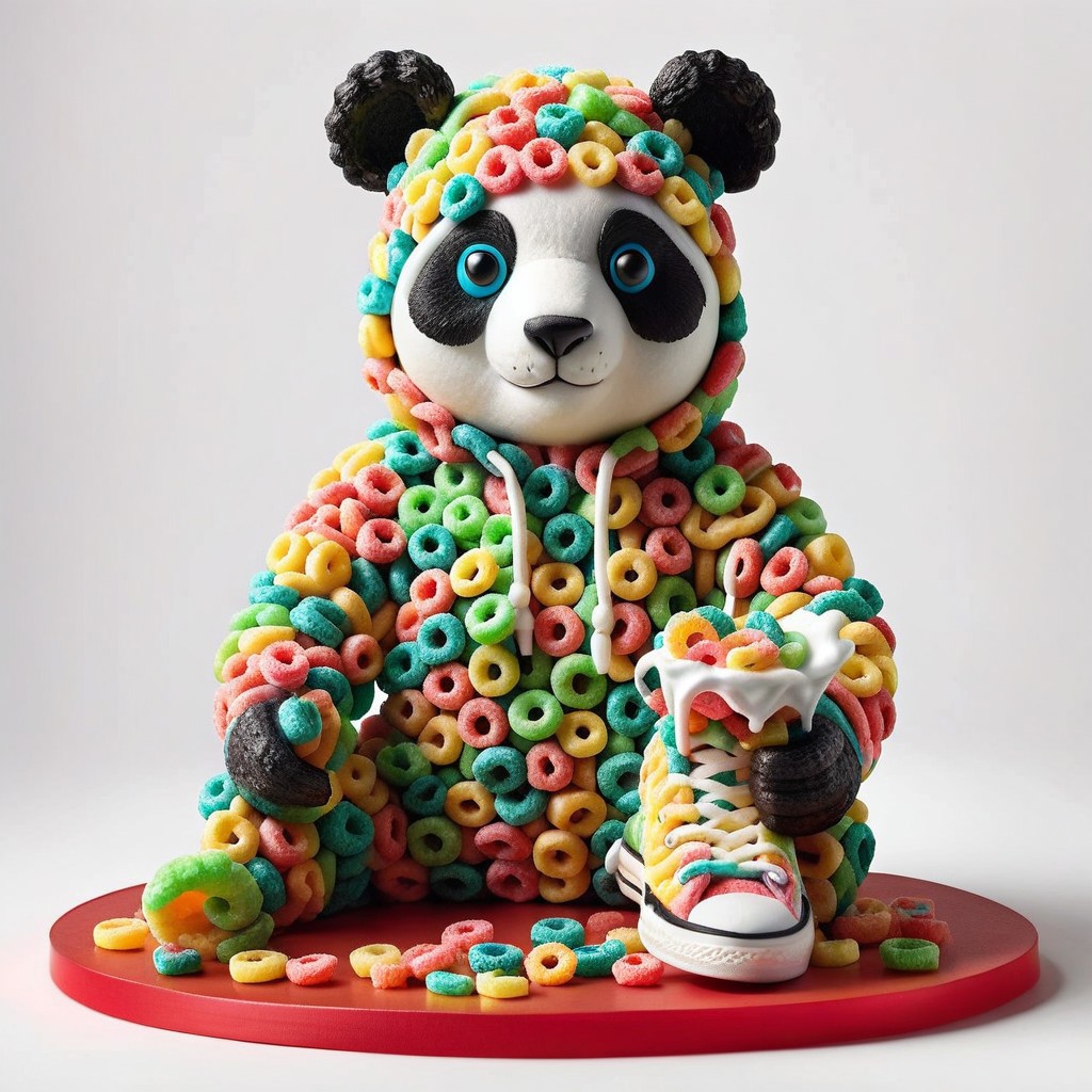 made of fruit loops, A panda wearing a hoodie made of fruit loops and converse shoes made of fruit loops. The panda is holding a plate standing in front a macdonald's