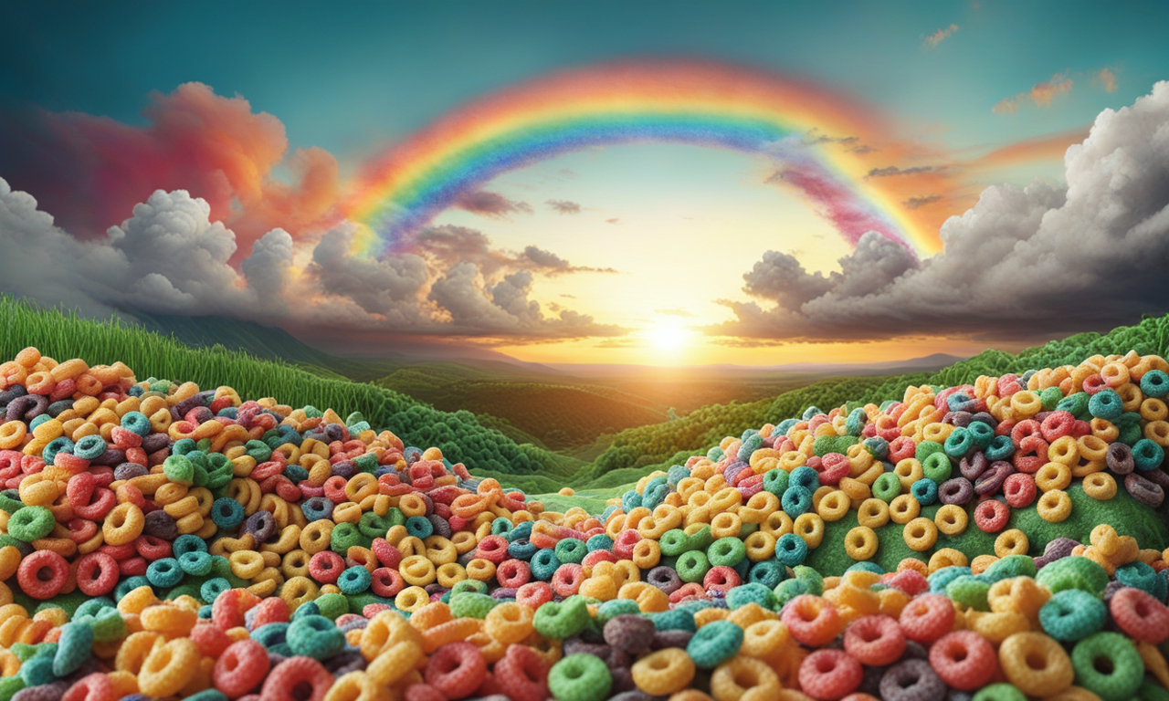 beautiful landscape, photo realistic, epic, cinematic view, beauty of nature, sunset, colorful clouds made of fruit loops <lora:FrootLoopStyle:0.94>