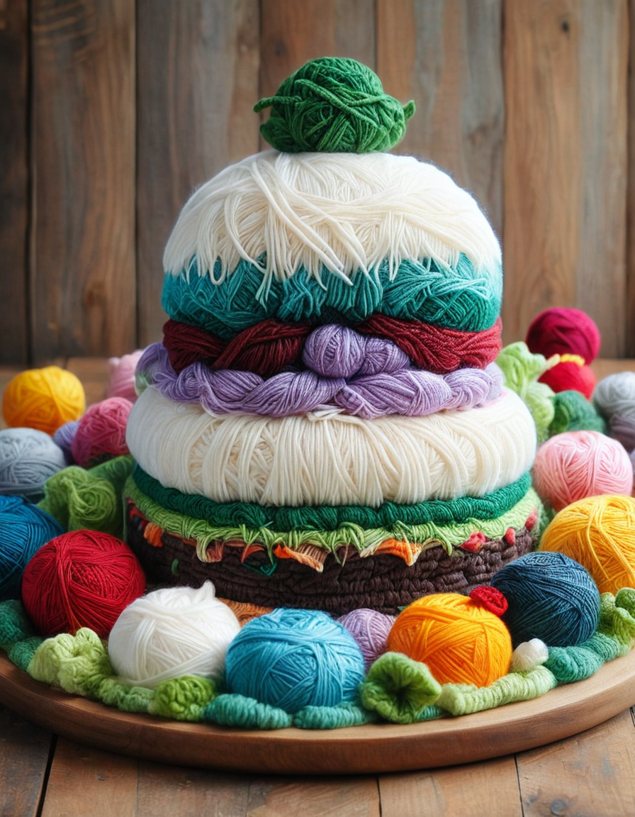 A giant yarn hamburger made of yarn, with detailed stitching for the lettuce, cheese, and patty, sitting on a yarn plate yrnwrld <lora:Yarnworld:1>