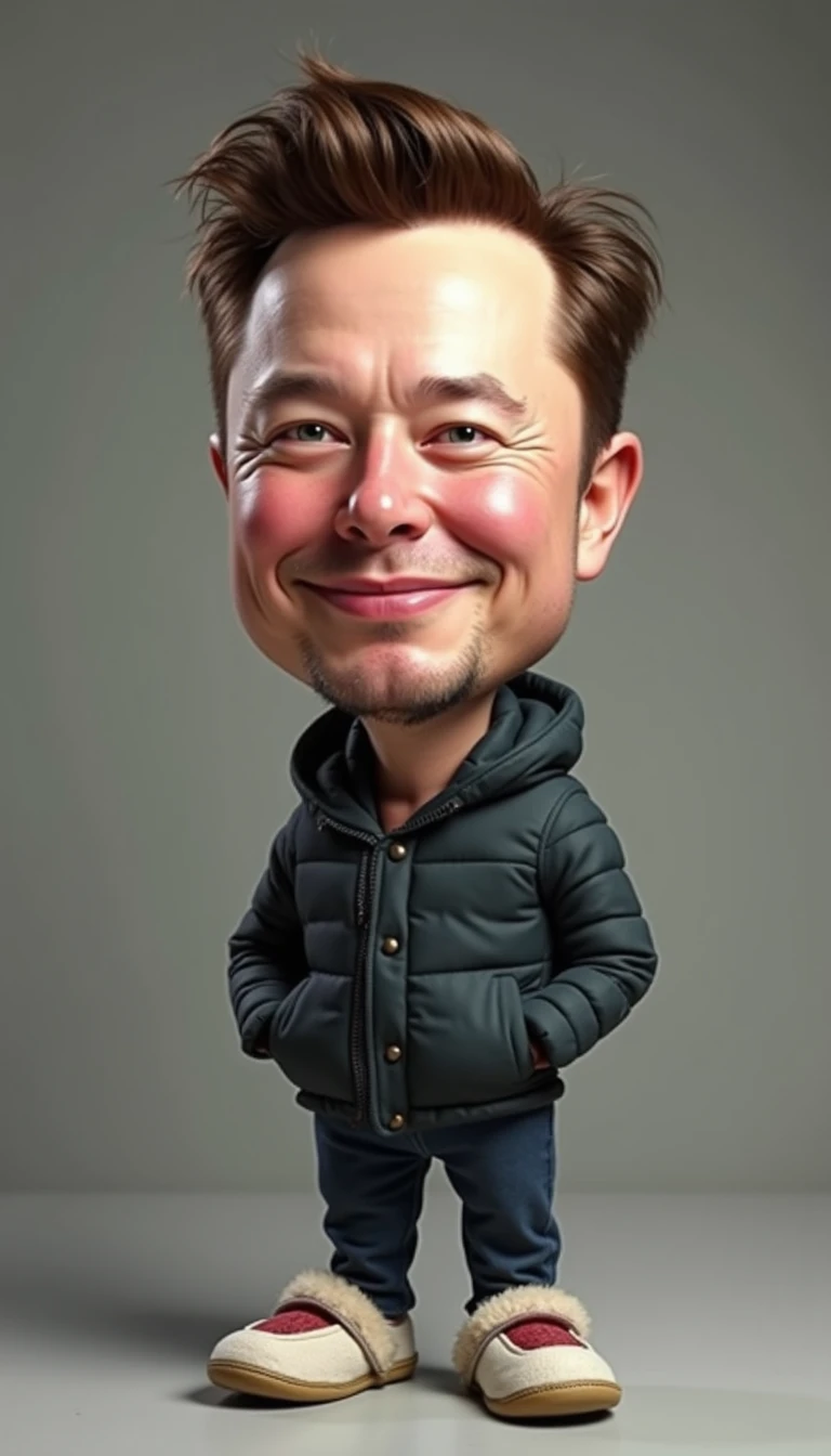 In the shape of a mini doll, a real caricature of Elon Musk, with a flattering appearance and a sarcastic smile on the corner of his mouth, on his feet he wears cute, fun slippers, he is looking at the camera