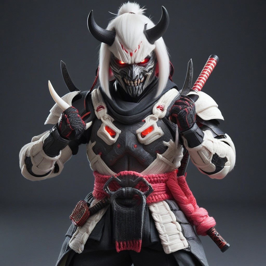 Yarnworld, A realistic Samurai holding a Squeaking Hammer Pounding Toy made of yarn, solo, armor made of yarn, 1boy, male focus, holding, dual wielding, samurai, helmet made of fruit loops, toy, horns, holding Toy, japanese armor made of yarn, holding hammer, light pink skin, red eyes, full body, fighting stance, Tokio background, tokio made of yarn, glowing, glowing eyes, sheath, standing, gloves, teeth, japanese clothes, white hair, shoulder armor, demon, looking at viewer, mask made of yarn, ponytail, fangs, sharp teeth, yarn shape armor