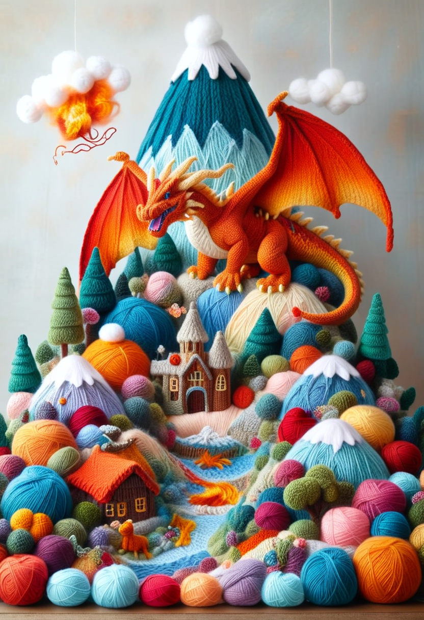 A massive dragon, but instead of scales, itâs covered in intricately woven yarn, breathing fire made of unraveling threads, flying over a knitted mountain landscape â yrnwrld, fantasy, highly detailed, soft textures <lora:sd_xl_dpo_lora_v1:0.1> <lora:MJ52:0.1> <lora:Yarnworld-000017:1.0>