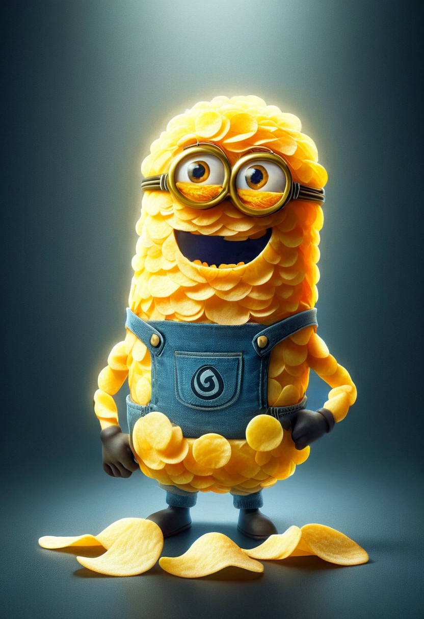 Minion minion(masterpiece, best quality, ultra-detailed), xiaohuangren, glasses, blue denim strap pants, <lora:xiaohuangren_v6-000017:0.8>, minions, (masterpiece, best quality, ultra-detailed),xiaohuangren,goggles,blue denim strap pants,minions,revice driver, p1nkch1ps, made out of potato chips,text( "Potato Chips":1.1), A fun party scene with bowls of potato chips and the text "Potato Chips" glowing brightly, minion minion, minion