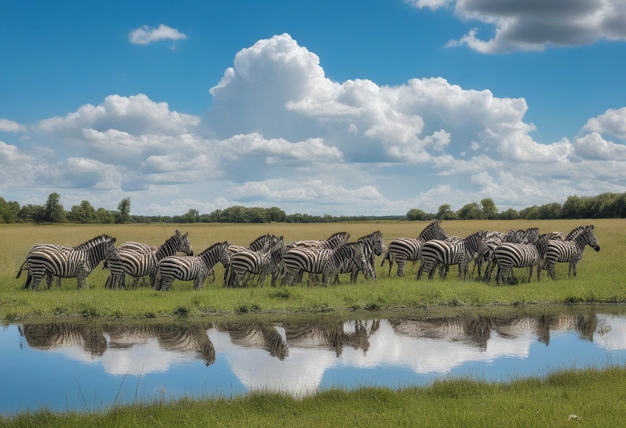horde of zebras in a meadow by a lake, blue sky and cumulus cloud, very realistic photography