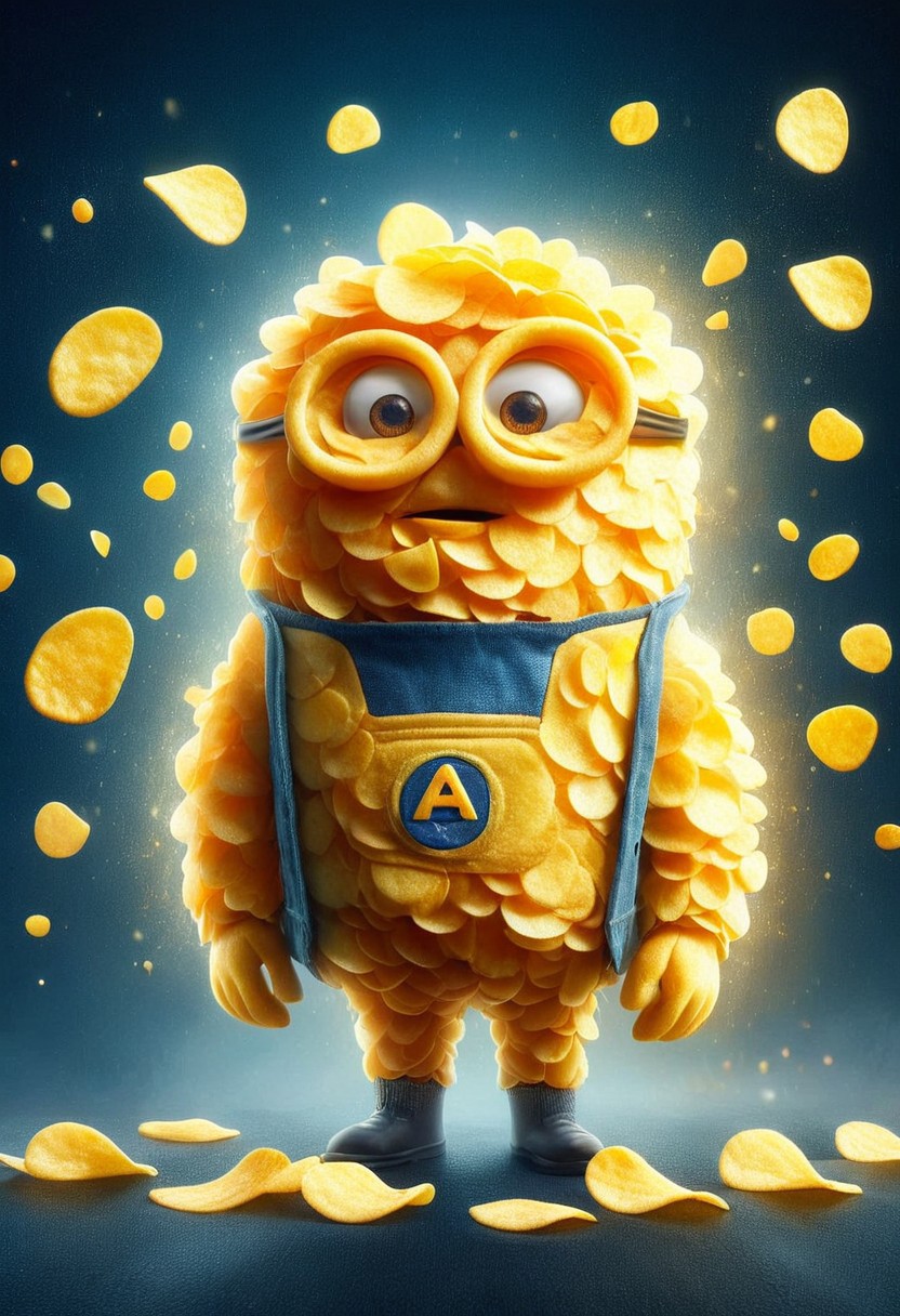 (masterpiece, best quality, ultra-detailed), xiaohuangren, glasses, blue denim strap pants, <lora:xiaohuangren_v6-000017:0.8>, minions, (masterpiece, best quality, ultra-detailed),xiaohuangren,goggles,blue denim strap pants,<lora:xiaohuangren_v6-000017:0.8>,minions,revice driver, p1nkch1ps, made out of potato chips,text( "Potato Chips":1.1), A fun party scene with bowls of potato chips and the text "Potato Chips" glowing brightly