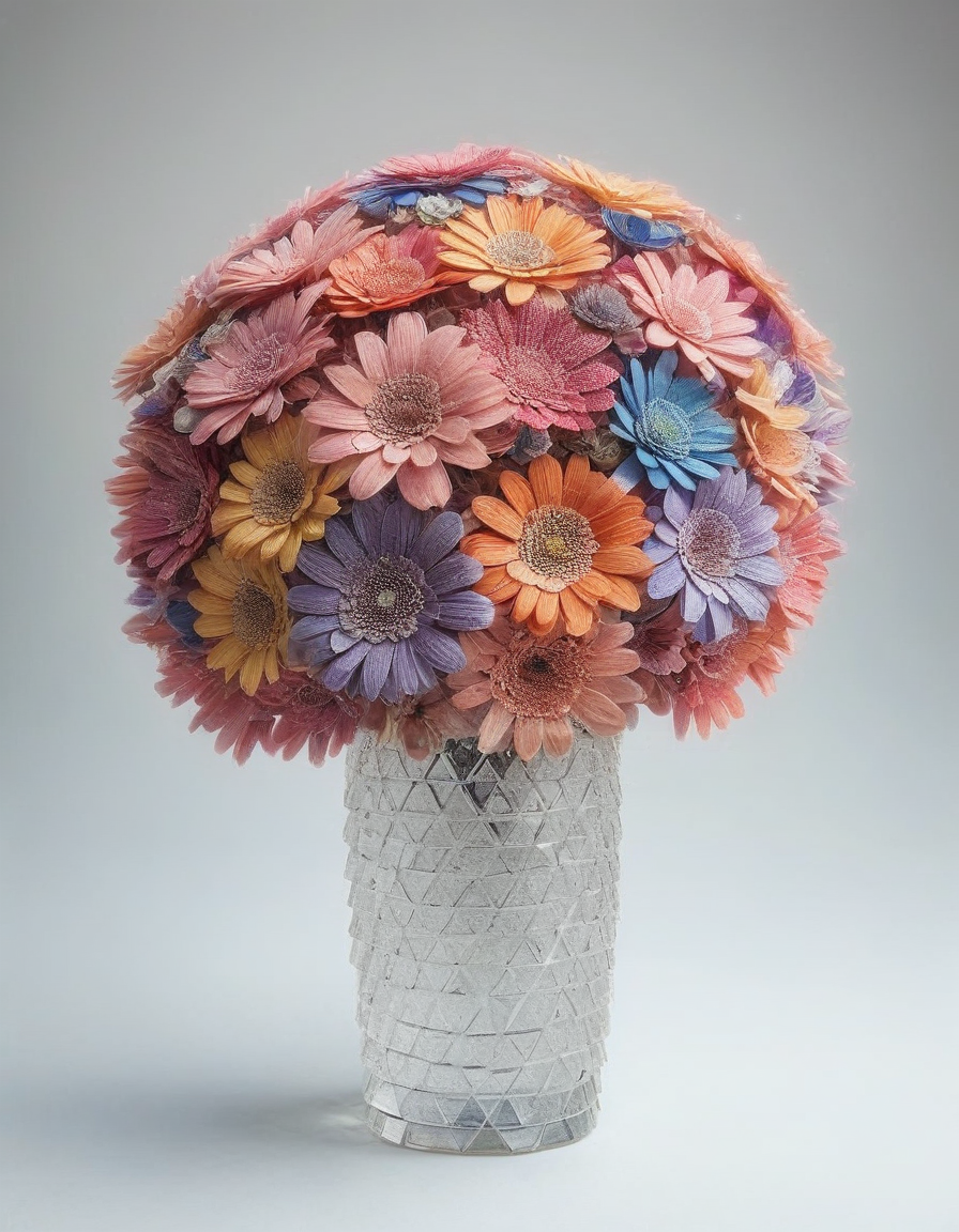 A vibrant bouquet of flowers, each petal made from mad-shingles, arranged in a crystal vase. <lora:Shingles_SDXL:1>