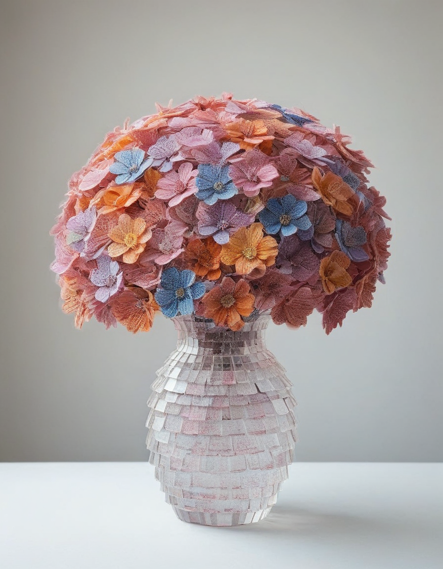 A vibrant bouquet of flowers, each petal made from mad-shingles, arranged in a crystal vase. <lora:Shingles_SDXL:1>