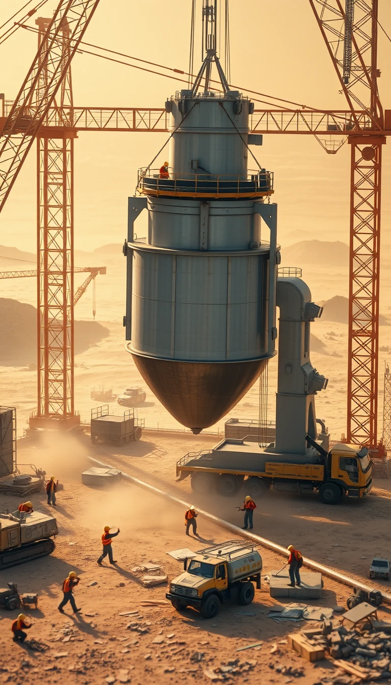 A massive industrial dough mixer is being assembled in a vast desert-like construction site. The mixer is suspended by large cranes, with miniature construction workers in safety gear welding, inspecting, and installing components. The dusty environment is filled with activity, as tiny workers move materials, operate heavy machinery, and engage in the assembly process. The scene captures an epic sense of scale, making the mixer appear as a colossal machine dominating the landscape. The atmosphere is warm and golden, with a cinematic depth, creating a surreal blend of industrial engineering and miniature construction work