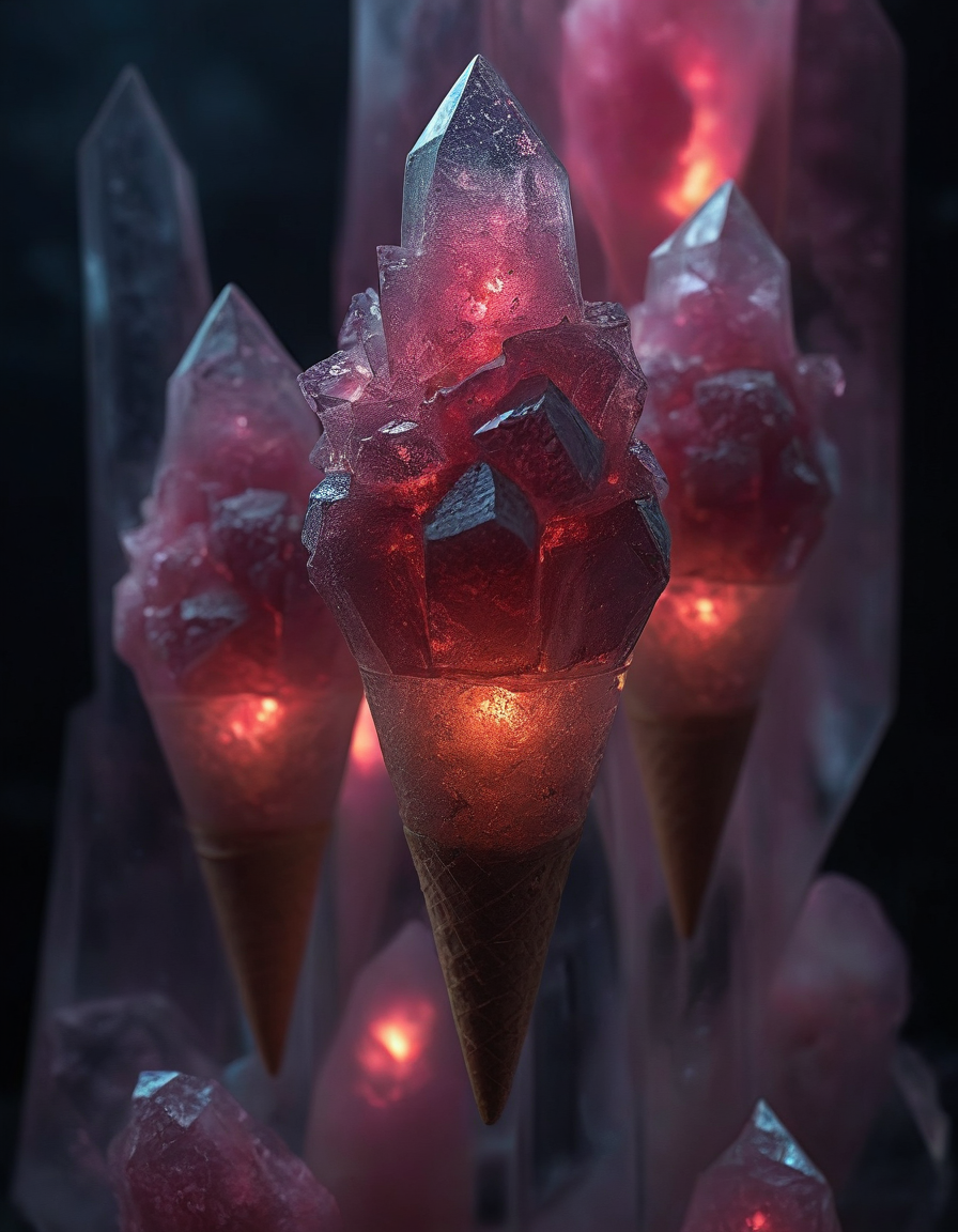 A cone of ice cream where each scoop is made of glowing crystal. The ice cream flows like liquid light, and the cone is crystallized, with sharp edges and geometric patterns. The scene is illuminated by a radiant, gem-like glow. <lora:SoulGemmed:1>
