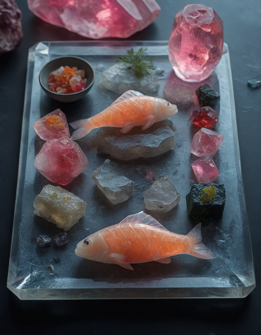 A platter of sushi where each piece is made of translucent crystal. The sushi rolls have geometric patterns on their surfaces, and the fish glows with inner light. The platter is surrounded by glowing gemstones and rests on a crystal table. <lora:SoulGemmed:1>