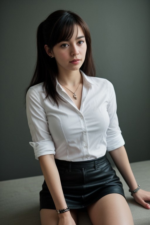 score_9, score_8_up, score_8, 1girl, solo, perfect face, light blue eyes, boot heels, formal white shirt, black skirt, cowboy shot, small breasts, long black hair, red highlights, elegant ponytail, bracelet, necklace, parted bangs, hand on hip, refined, volumetric lighting, cinematic lighting, blurry background, close up