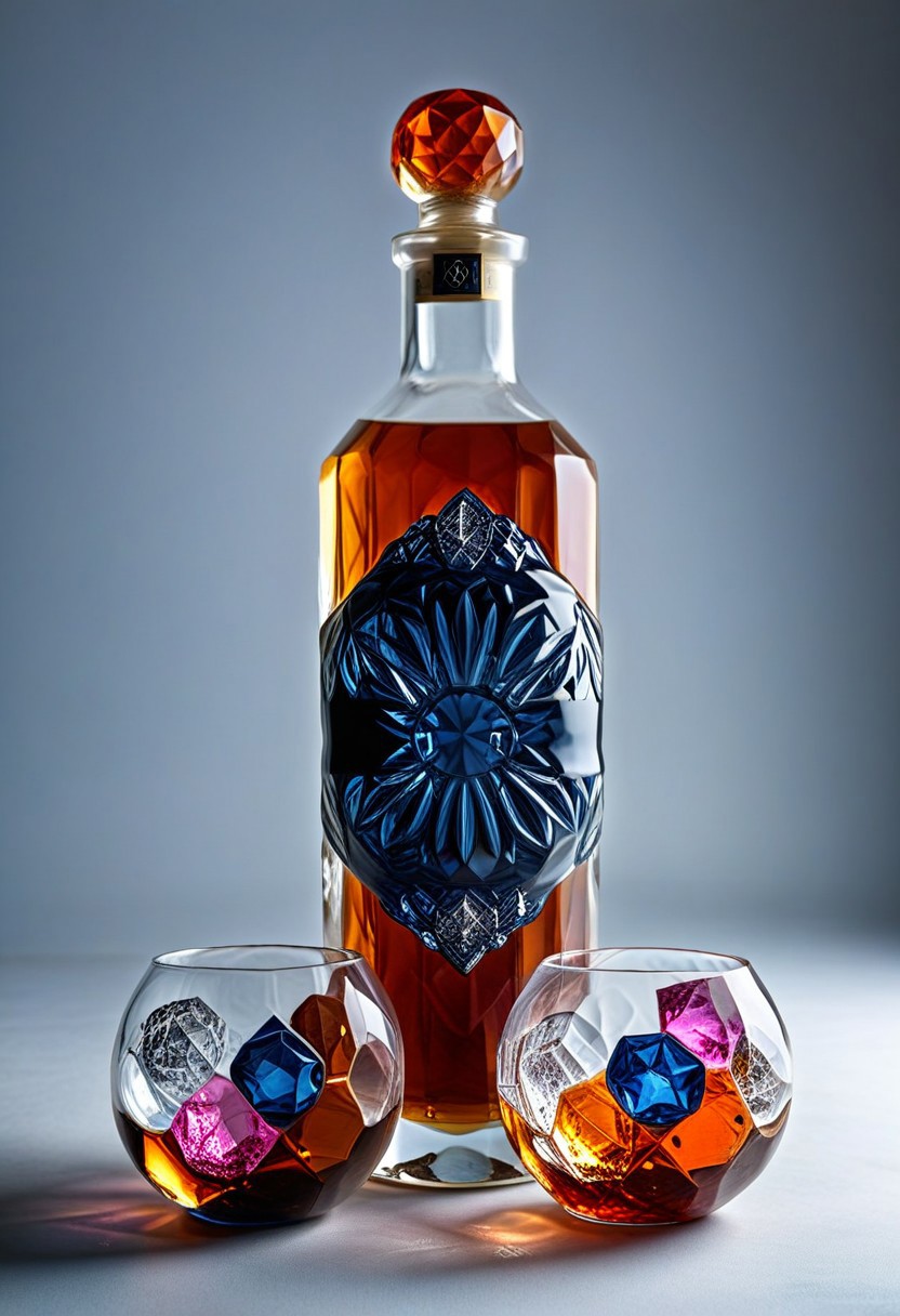 rp_slgd, 2balls1shaft, still life, An epic photo of two round ball-shaped tumbler glasses, long whiskey bottle, made of crystal simple background, realistic, masterpiece, best quality, highly detailed, sharp focus, dynamic lighting,