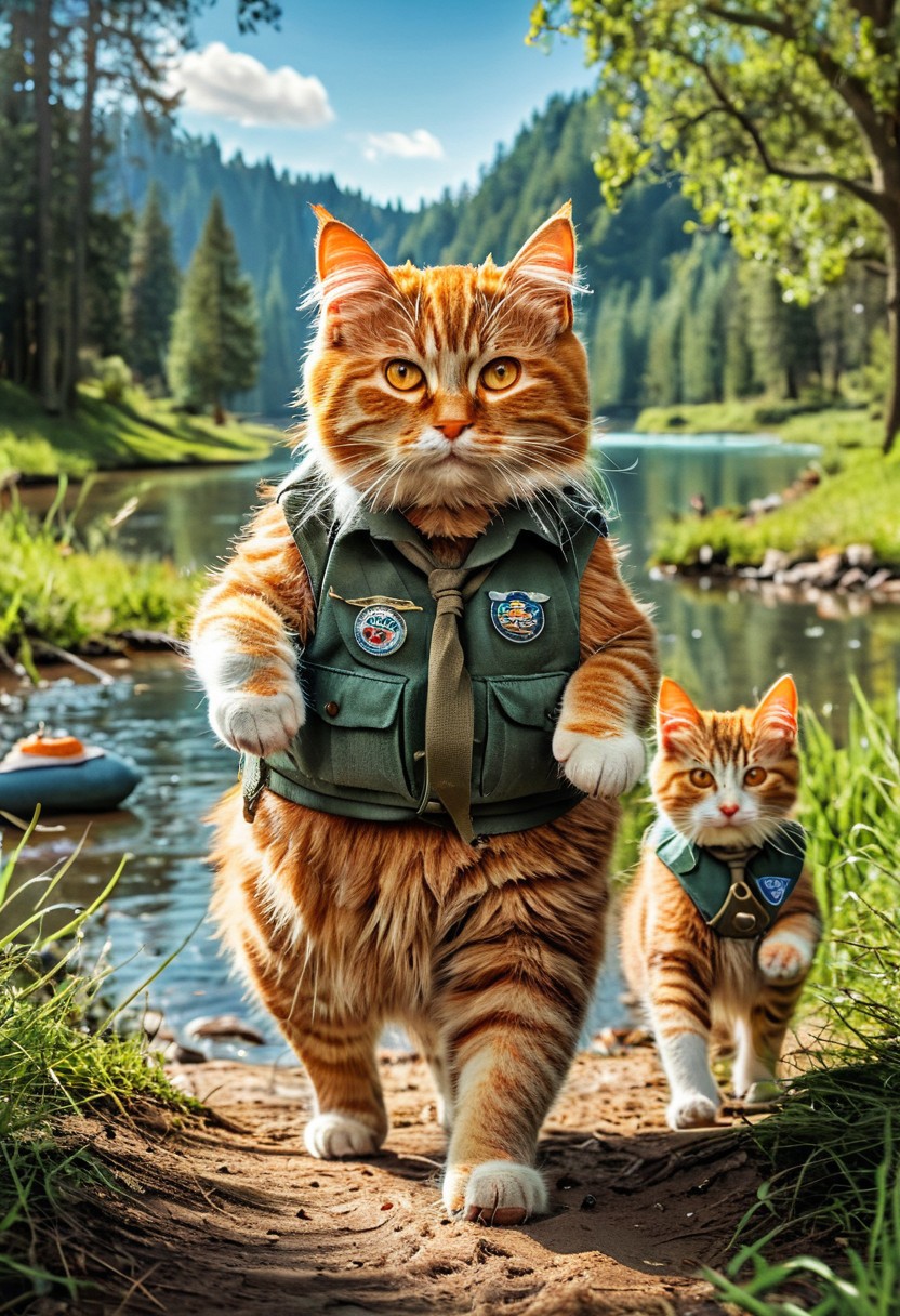fluffy orange tabby fat cat wearing scout uniform walking guiding kittens wearing scout uniform, camping in the background, morning, grass land background, there is a tree far in the background, river in side, camping cat, cat and kittens standing and walking like human and children,
