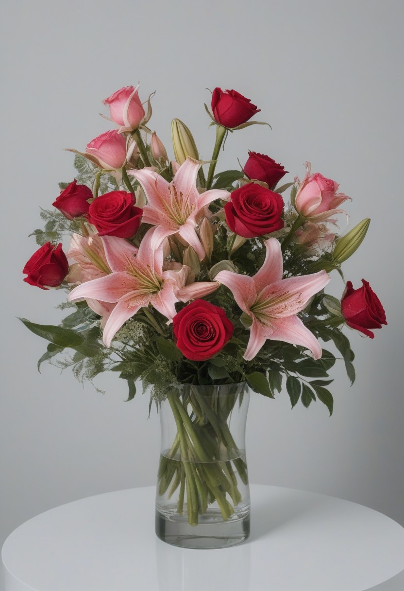 Bouquet of red roses and pink roses and lily flowers placed in a transparent vase in which we see the stems of the flowers, very realistic photography