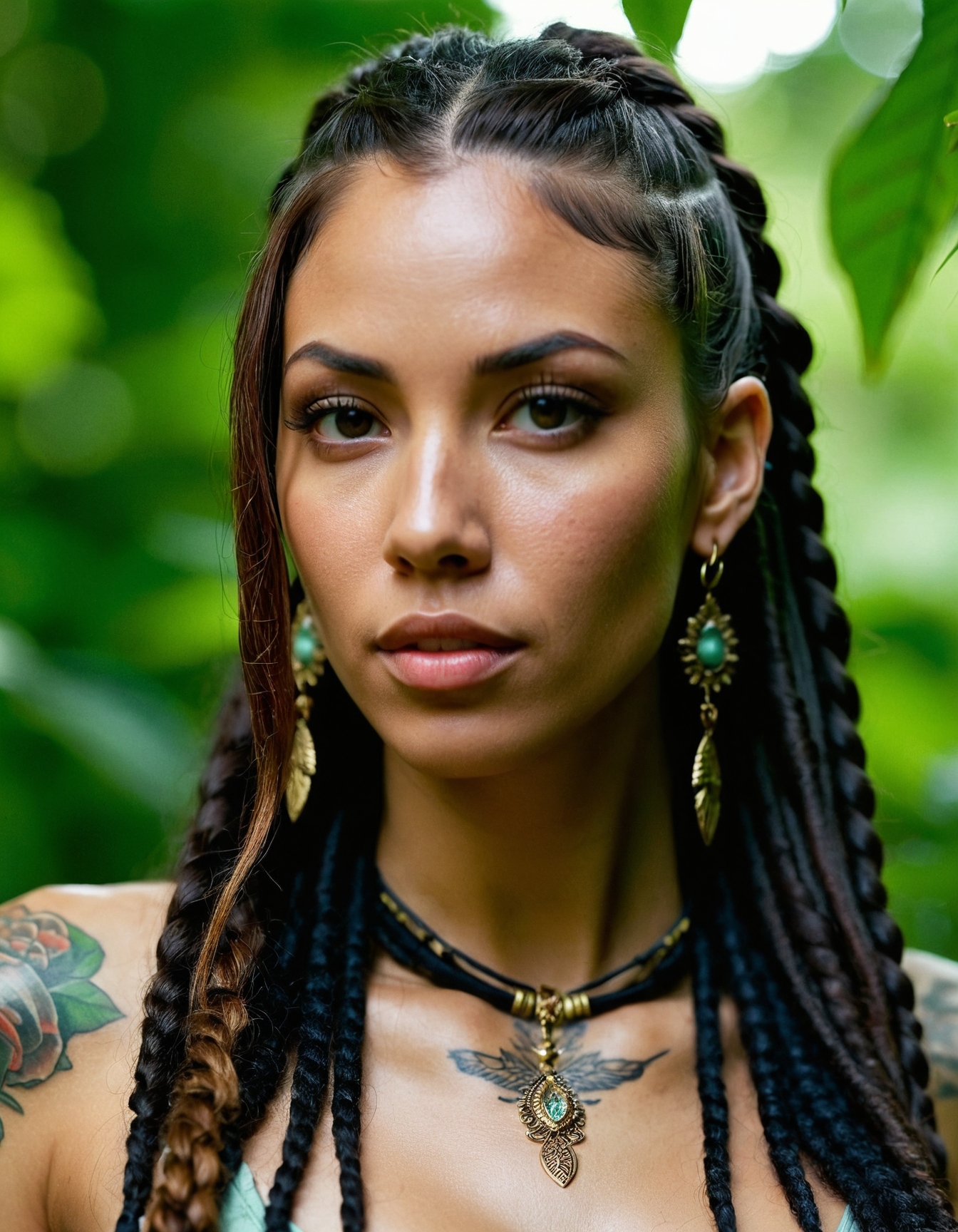 A photo realistic shoot from a portrait camera angle about a portrait of a woman with long dreadlocks and intricate tattoos, set against a blurred background of greenery. the image also shows a woman in the middle of the image, who appears to be a young adult, with fair skin and dark brown hair styled in a long, braided ponytail. she is facing the viewer and looking directly at them with a neutral expression. her eyes are brown and her lips are parted. she has a necklace and earrings on, and her body is adorned with intricate, detailed tattoos. the background is a lush, green forest with blurred greenery, giving the image a dreamy, ethereal quality.