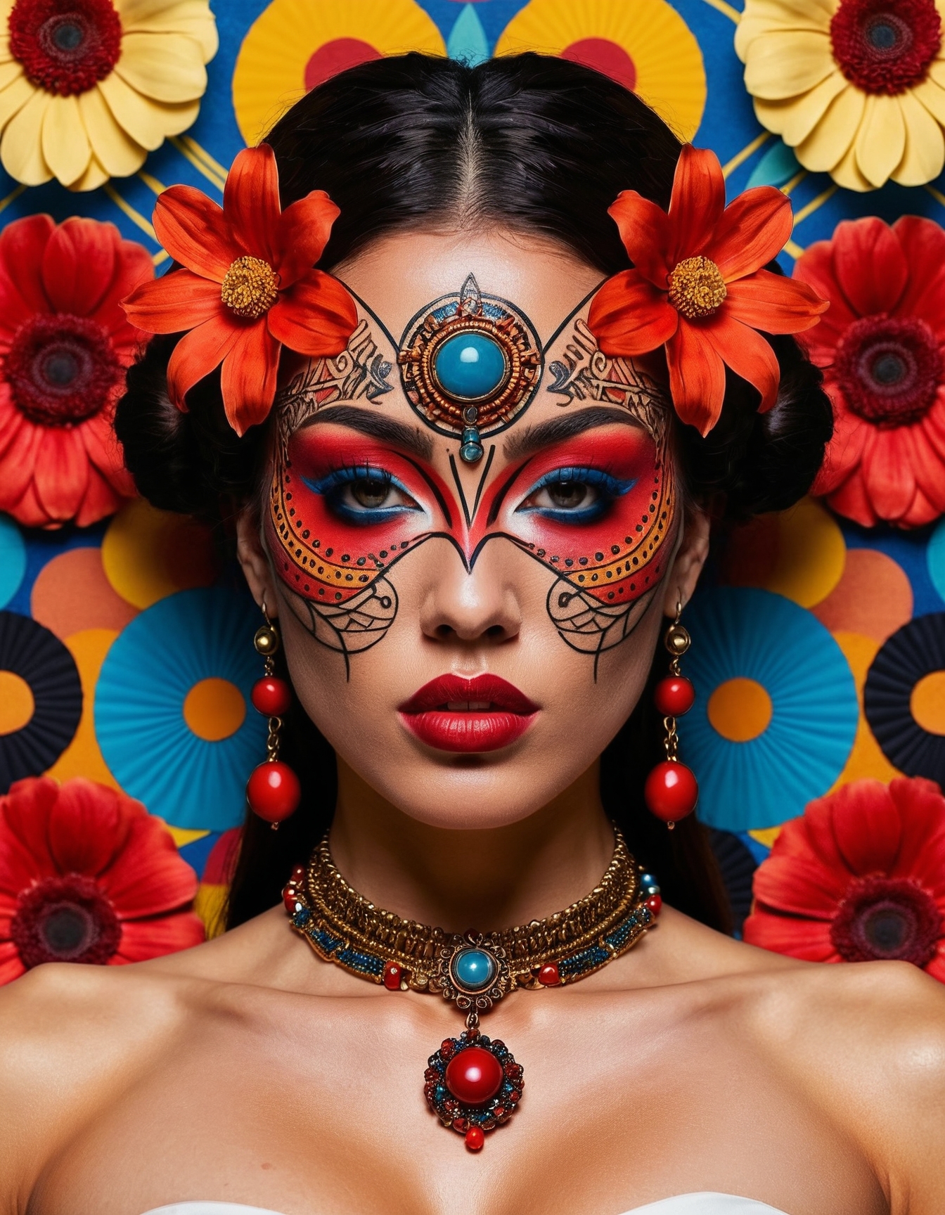 A photo-realistic shoot from a frontal camera angle about a woman with a surreal face design, surrounded by a collage of abstract patterns in red, yellow, and black. the image also shows a woman standing in the middle of the image, with her upper body facing the viewer. she has long brown hair, fair skin, and a neutral expression. her body is covered in intricate, colorful tattoos with flowers and patterns, including a large blue sphere at the center of her face, which appears to be a mask. her breasts are small and her nipples are visible. she is wearing a necklace with a zipper and earrings. the background features a circular pattern with various abstract designs, and the overall color scheme is predominantly red, black, and white.