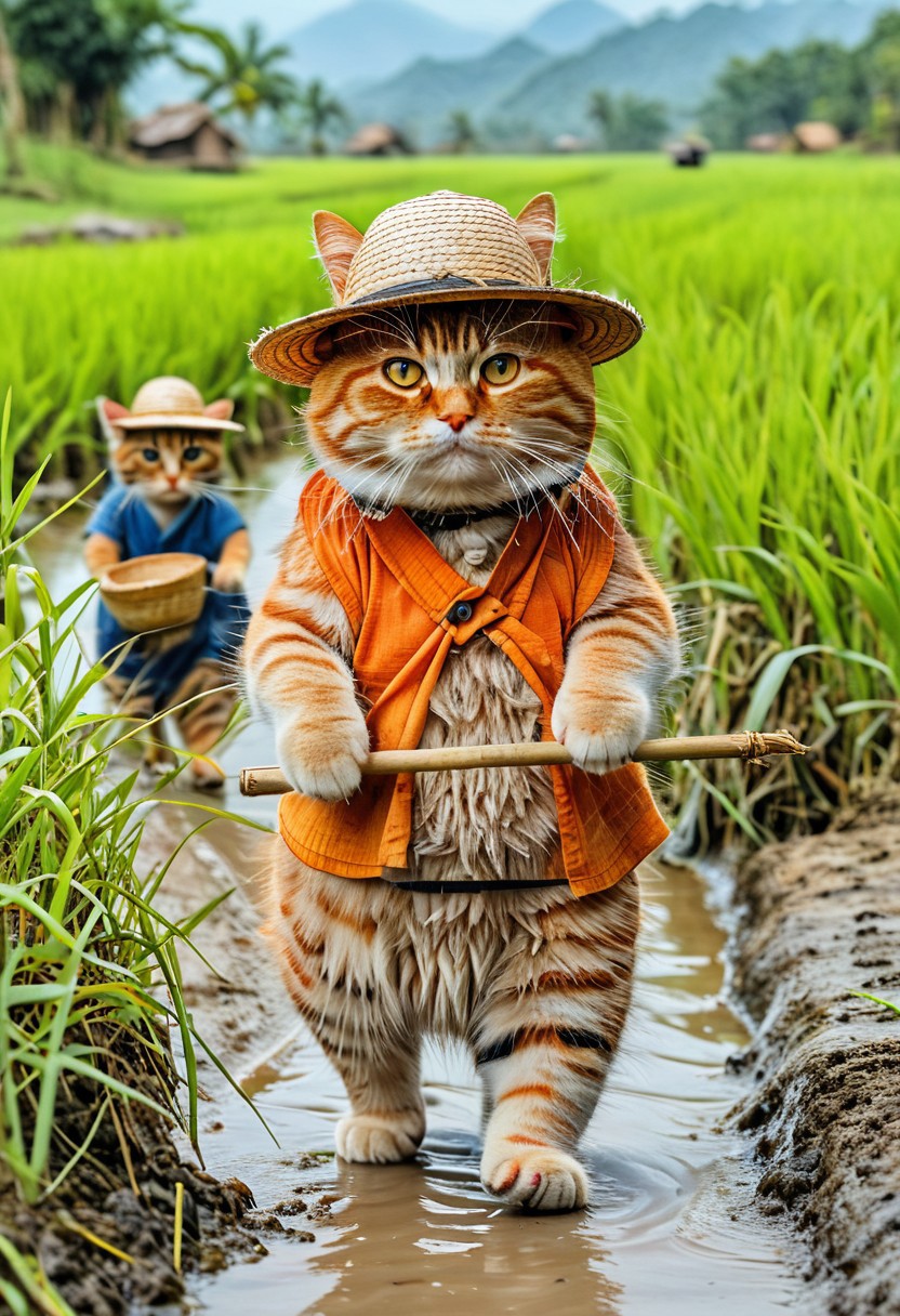 fluffy orange tabby fat cat wearing straw hat, asian farmer hat, walking guiding kittens wearing asian clothes, rice paddy, paddy, rice field in the background, morning, grass land background, there is a tree far in the background, river in side, asian farmer cat, cat and kittens standing and walking like human and children, cat work harvesting rice, cat holding, farmer tools