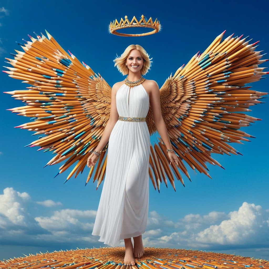 Pencil_morph_style, a woman, blonde hair, white wings, barefoot, solo, angel, jewelry, white dress made of pencils, anklet, angel, wings made of pencils, short hair, full body, bare shoulders, looking at viewer, clouds background, feathered wings made of pencils, toes, blue eyes, feet, bracelet, braid, smile, gem,sleeveless, armlet, crown made of pencils, closed mouth, realistic, photorealistic, lips, pants, flying, bracer, floating, toe ring, necklace, clouds