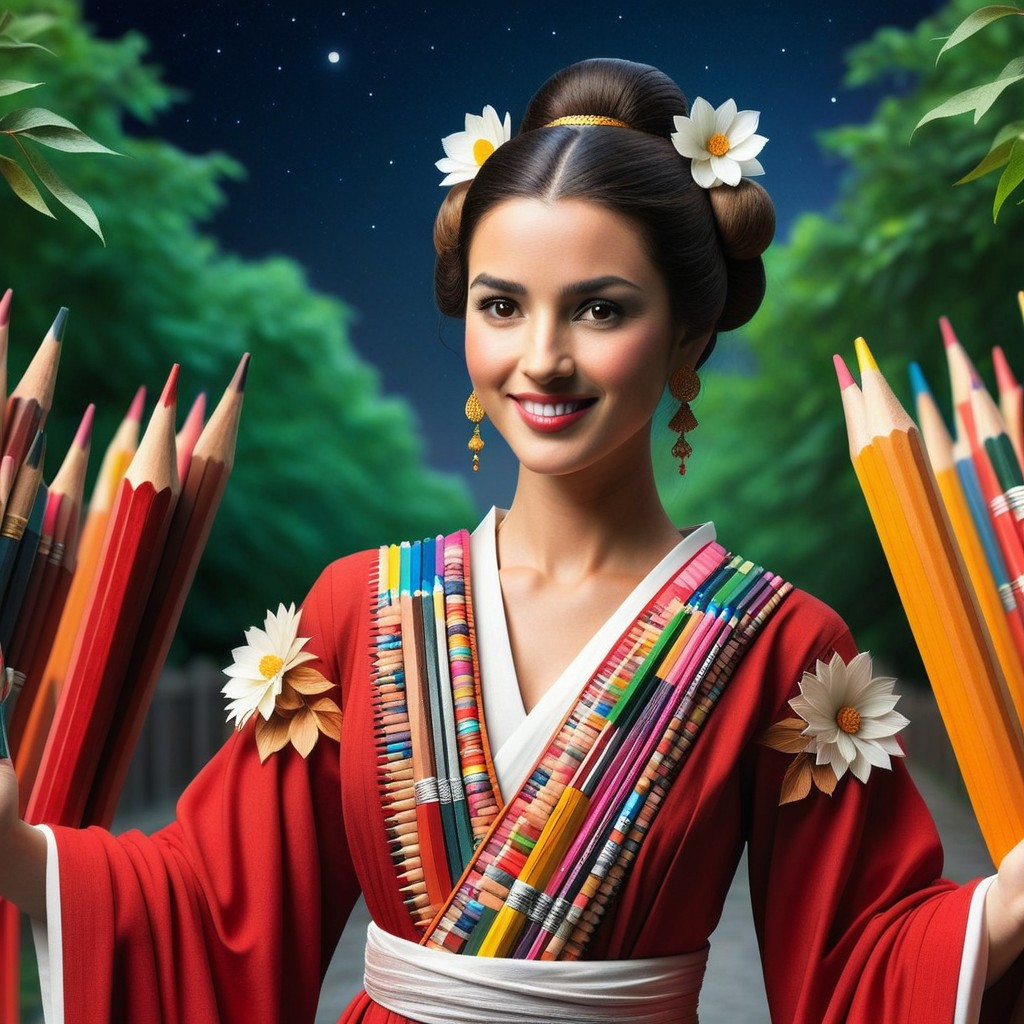 Pencil_morph_style, score_10 , score_9, score_8_up, score_8, Masterpiece, High Details, HD, 8K, Photorealistic, perfect, High Quality, a woman, asian, black hair, brown eyes, chinese clothes made of pencils, pencil texture, clothes made of pencils, medium body shot, smiling, dress made of pencils, earrings, pencil patterns, highly detailed, photorealistic, fence, print, flower, hair bun, hair ornament, hair stick, hand up, jewelry, leaf, light skin, light smile, lipstick, long hair, long sleeves, looking at viewer, makeup, moon, night, outdoors, parted bangs, plant, railing, red lips, single hair bun, sky, sleeves past wrists, slim, solo, standing, updo, upper body, red and white hanfu, white flower, wide sleeves,
