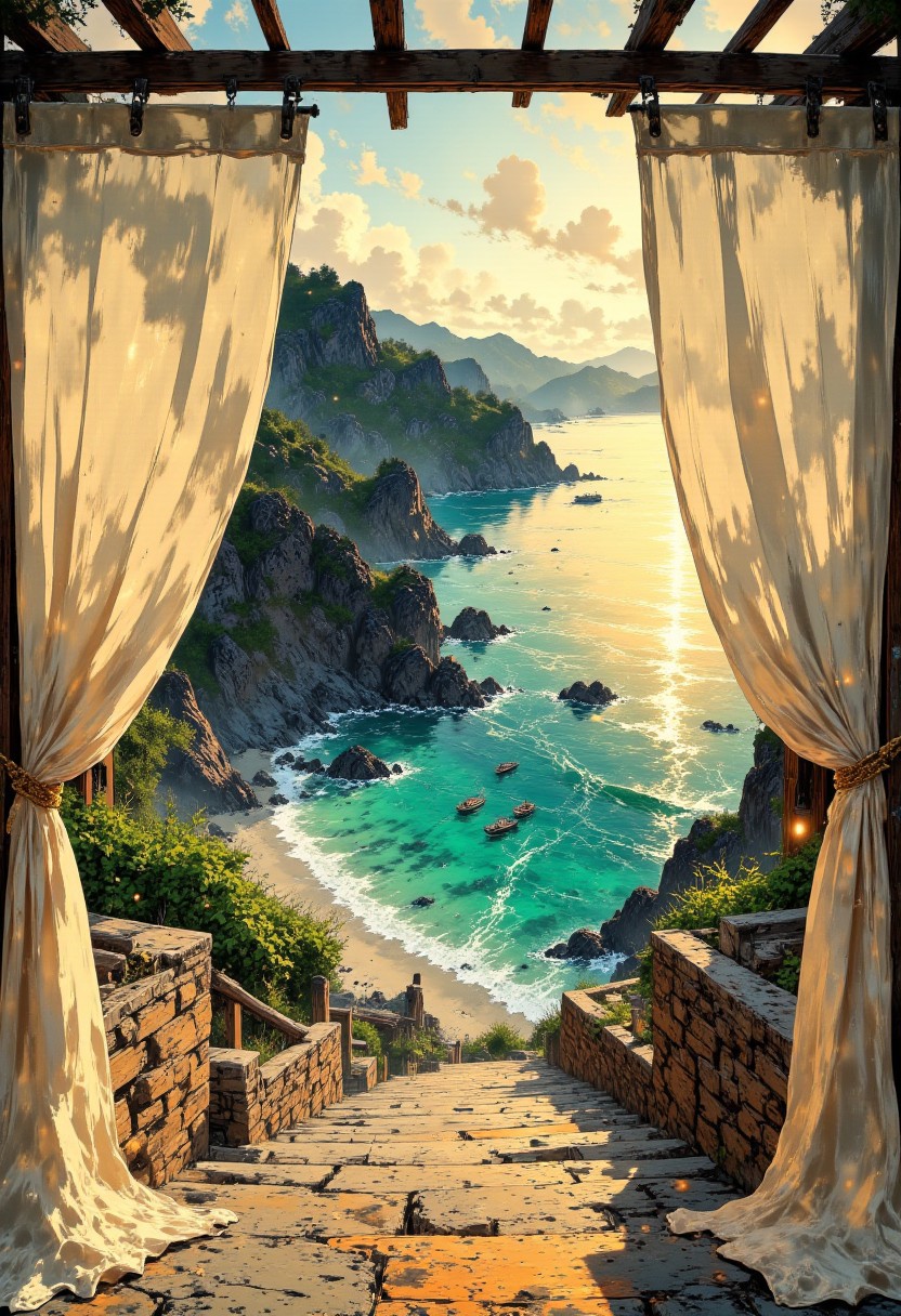 Santorini Cliffside Beach – Sheer White Curtain "A breathtaking view of a hidden cove in Santorini, Greece, where turquoise waters meet white sand beneath towering cliffs. A sheer white curtain billows gently in the warm breeze from a pergola-covered terrace, framing the deep blue Aegean Sea. The golden hues of the sunset reflect on the smooth stone pathways leading to the secluded beach, while small fishing boats float lazily in the distance."