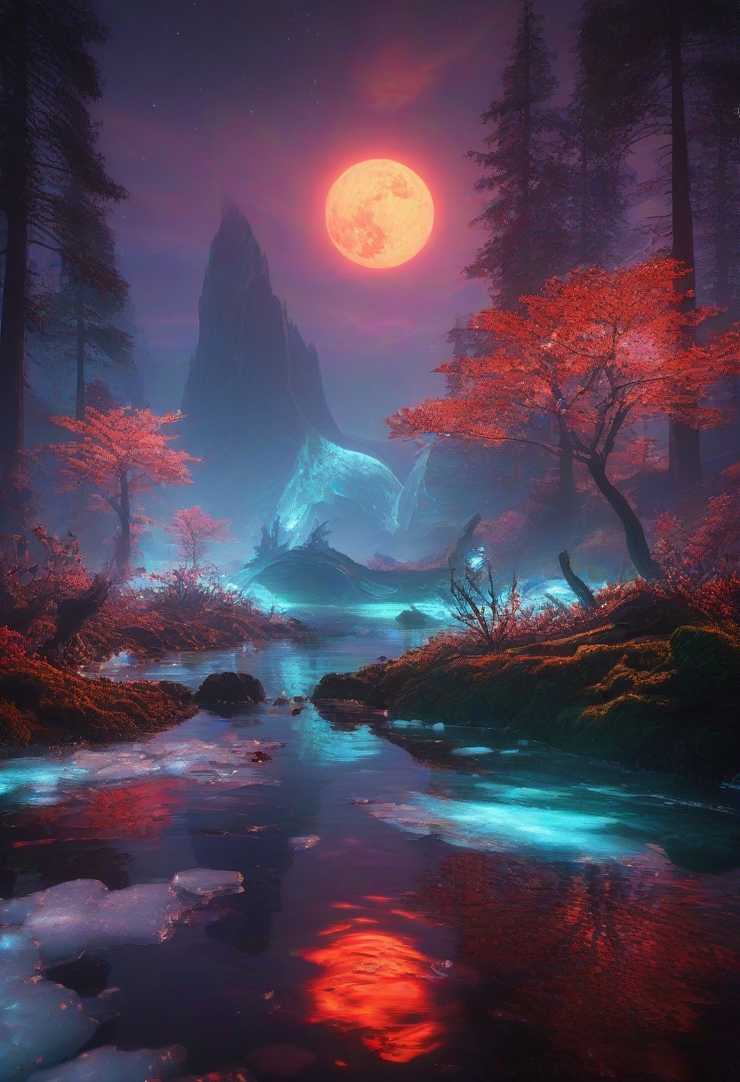 Ultrarealistic. sharp focus, dynamic lighting. play of light, reflection, refraction, Raytracing, Ultra detailed. Alien themed. Alien scenery. alien scenery background. alienworld. An alien fire dragon surrounded by ice.enchanting, cosmic, celestial, ethereal, vibrant flora, magical, luminous, serene, dreamy, radiant, bioluminescent, intricate details, surreal, enchanted forest