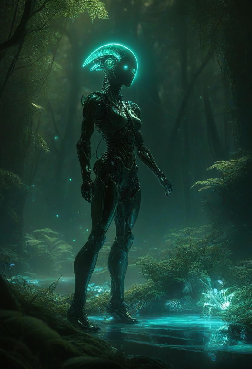 Ultrarealistic. sharp focus, dynamic lighting. play of light, reflection, refraction, Raytracing, Ultra detailed. Alien themed. Alien scenery. alien scenery background. alienworld. A gorgeous female robot in an alien forest. surrounded by ice.enchanting, cosmic, celestial, ethereal, vibrant flora, magical, luminous, serene, dreamy, radiant, bioluminescent, intricate details, surreal, enchanted forest