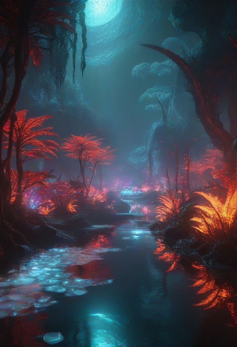 Ultrarealistic. sharp focus, dynamic lighting. play of light, reflection, refraction, Raytracing, Ultra detailed. Alien themed. Alien scenery. alien scenery background. alienworld. An alien fire dragon surrounded by ice.enchanting, cosmic, celestial, ethereal, vibrant flora, magical, luminous, serene, dreamy, radiant, bioluminescent, intricate details, surreal, enchanted forest