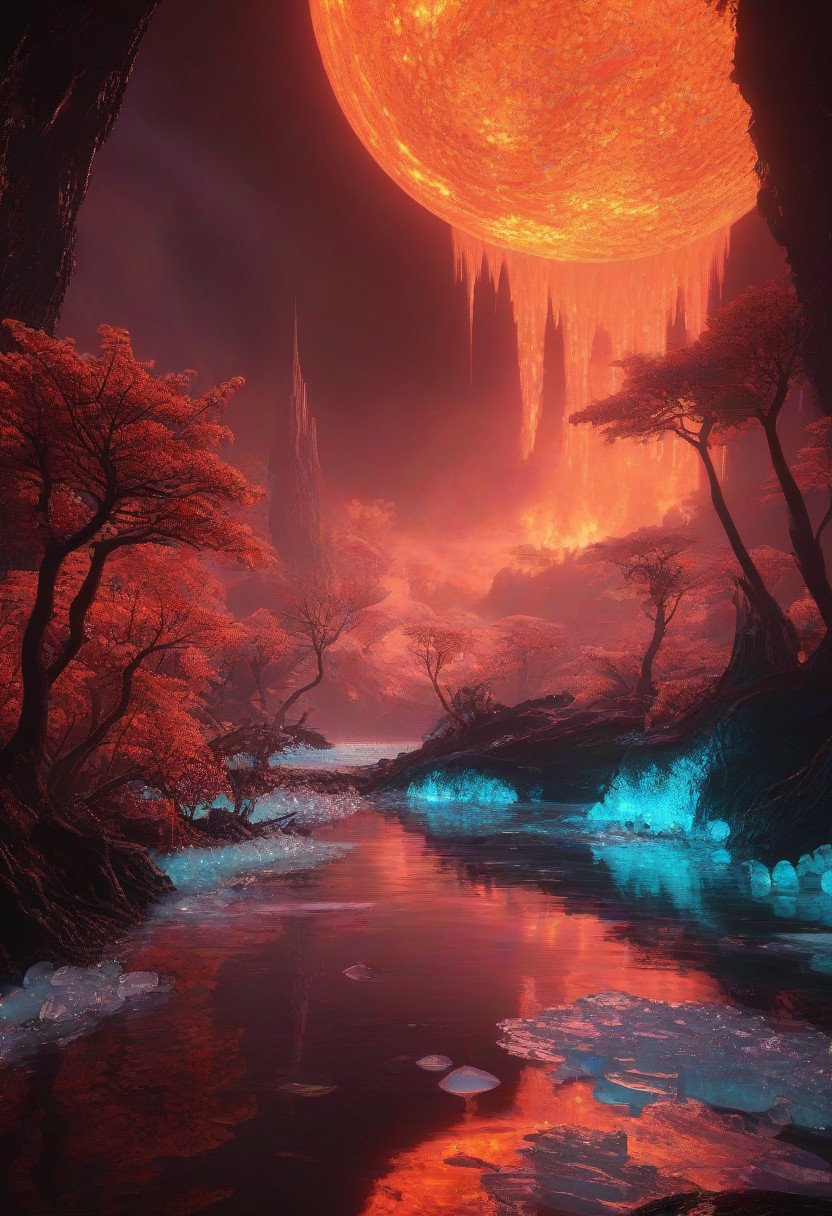 Ultrarealistic. sharp focus, dynamic lighting. play of light, reflection, refraction, Raytracing, Ultra detailed. Alien themed. Alien scenery. alien scenery background. alienworld. An alien fire dragon surrounded by ice.enchanting, cosmic, celestial, ethereal, vibrant flora, magical, luminous, serene, dreamy, radiant, bioluminescent, intricate details, surreal, enchanted forest