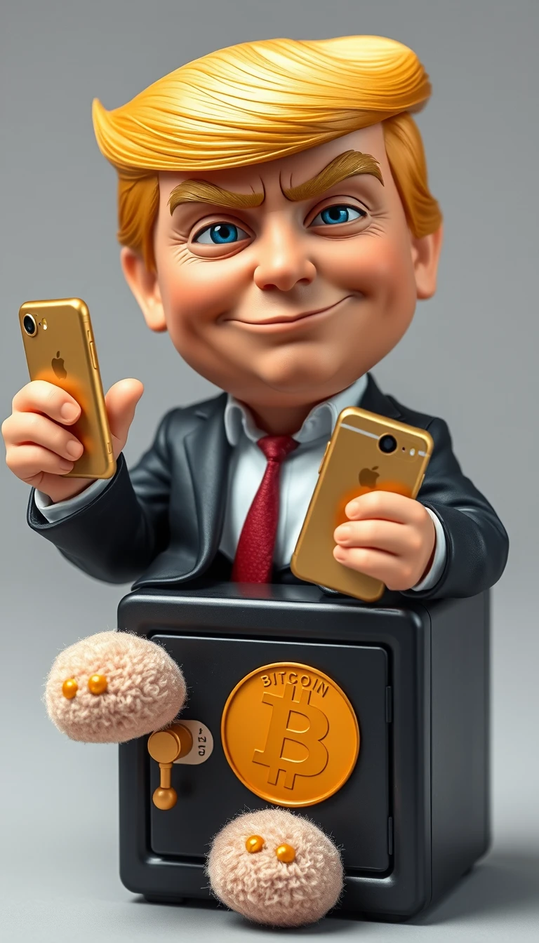 A real-life mini-cartoon of "Barron Trump" with a flattering appearance and a sarcastic smile on the corner of his mouth, blue eyes. He has his right hand raised in a positive gesture and is holding a gold iPhone in his left hand. He is sitting on top of a mini safe with the Bitcoin logo on it. He is wearing cute and funny slippers and is looking at the camera, winking with his left eye.