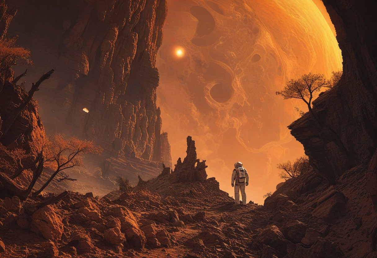 A lone astronaut stands tall at the edge of a dense alien world, framed by rugged landscape as sun sets behind him, casting warm orange glow on rustic terrain. His peaceful demeanor contrasts with the vastness of diverse trees and rocks stretching out in every direction. He gazes out at breathtaking scenery, rock cliff at his side, masterpiece,absurdres,photorealistic,best quality